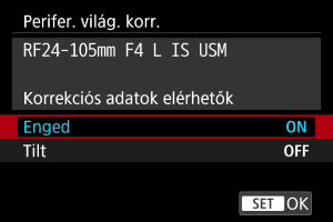 - Nem Canon gyártmányú objektív használata esetén akkor is ajánlatos a(z) [Tilt] beállítást választani, ha a kijelzőn a(z) [Korrekciós adatok elérhetők] felirat látható.