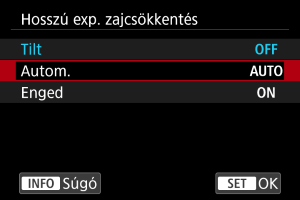 A zajcsökkentést a készülék minden 1 másodperces vagy hosszabb expozíció esetén elvégzi. A(z) [Enged] beállítással azok a zajok is csökkenthetők, amelyek a(z) [Autom.] beállítással nem észlelhetők.