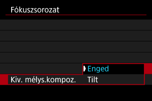A fókuszsorozat funkcióval úgy végezhet folyamatos felvételt, hogy a fókusztávolság automatikusan változik minden felvétel után. Ezek a képek lehetővé teszik, hogy egyetlen fókuszban lévő képet hozzon létre nagy mélységélességgel. A komponálás egy olyan alkalmazással is lehetséges, amely támogatja a mélységkomponálást, például a Digital Photo Professional (EOS szoftver) segítségével.