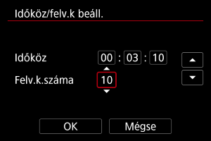 A felvételi időzítő használatakor beállíthatja a felvételi időközt és a felvételek számát, hogy a fényképezőgép folyamatosan felvételeket készítsen a megadott időközönként addig, amíg el nem készült a megadott számú felvétel.