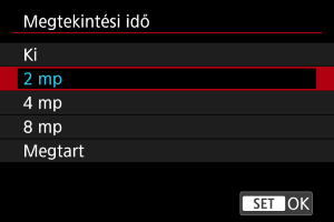 Ha azt szeretné, hogy a felvételkészítést követően a készülék hosszabb ideig jelenítse meg a képet, állítsa a(z) [Megtart] lehetőségre, míg ha nem szeretné megjeleníteni az elkészített képet, válassza ki a(z) [Ki] beállítást.