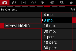 Beállíthatja, hogy miután valamilyen művelet (például az exponálógomb félig történő lenyomása) miatt megjelent, milyen hosszú ideig számoljon a mérési időzítő (ez határozza meg az expozíciósérték-megjelenítés/AE-rögzítés időtartamát).
