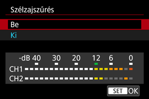 Ha a(z) [Enged] beállítást választja, a készülék csökkenti a szél zaját a szabadban. A Szélzajszűrő funkció bekapcsolása esetén a készülék bizonyos mértékig a mély hangok mennyiségét is csökkenti.