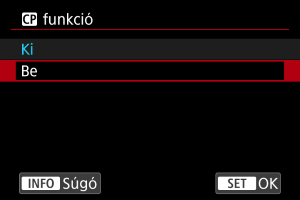 | Activate | Be, Ki | A módosítás akkor lehetséges, ha a beállítás [On] értékre van állítva |