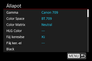 Black Fekete szint beállítása Nem érhető el, ha a(Z) [Gamma/Color Space] beállítás [Canon Log 2] vagy [Canon Log 3] értékre van állítva |