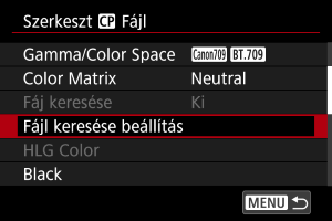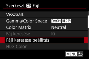 - Nem használható a regisztrált look fájl, ha a regisztrálást követően módosítja a(z) [Gamma/Color Space], [HLG Color] vagy [Over 100%] beállítást.