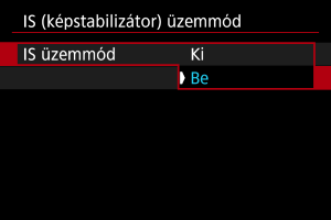 - A fényképezőgép IS módjának használatához válassza a(z) [Be] lehetőséget.