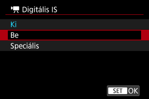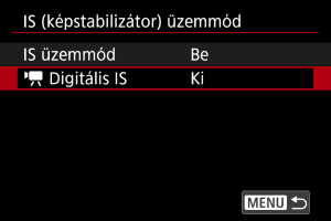 Digitális IS] opció [Be] vagy [Speciális] értékre történő állítása a(z) [IS üzemmód] mód opciót is [Be] értékre állítja.