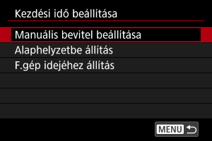 A(z) [Manuális bevitel beállítása] vagy [F.gép idejéhez állítás] opcióval beállított időt „00:00:00.” vagy „00:00:00:” értékre állítja vissza. ().