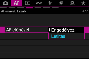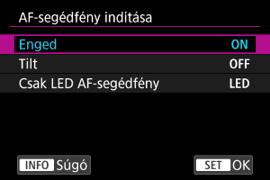 Lehetőség van arra, hogy letiltsa vagy engedélyezze a fényképezőgép, illetve az EOS fényképezőgépekhez tervezett Speedlite vakuk AF-segédfényének indítását.