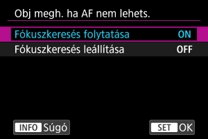 - A(z) [Fókuszkeresés leállítása] beállítás javasolt a szuper teleobjektívek vagy más olyan objektívek esetén, amelyek nagy fókuszterületet fednek le, ugyanis így elkerülhető a fókuszkereső meghajtás lényeges késése olyankor, amikor az objektív jelentős mértékben fókuszon kívül kerül.