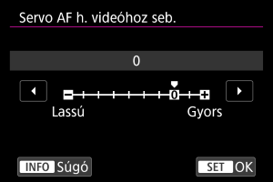 Beállíthatja a Servo AF használata videóhoz funkcióra vonatkozó AF-sebességet. A funkció a(z) [: Servo AF videóhoz] menüpont [Servo AF videóhoz] beállításának [Enged] értékre történő állításával engedélyezhető, amikor lassú fókuszátmenettel kompatibilis objektíveket használ a videofelvétel során.*
