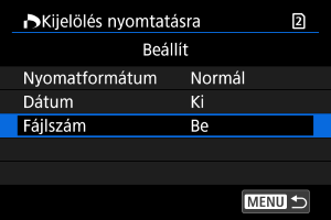 Megadhatja a nyomtatási beállításokat, például a nyomatformátumot, a dátumnyomtatást, a fájl számának nyomtatását és így tovább. A rendszer a nyomtatásra kijelölt összes képre alkalmazza a nyomtatási beállításokat. (Ezek az értékek nem adhatók meg külön minden egyes képhez.)