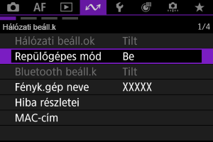 Ha nem szeretné fenntartani a(z) Wi-Fi- vagy Bluetooth-kapcsolatot, amikor a fényképezőgép ki van kapcsolva, állítsa a(z) [: Repülőgépes mód] beállítást [Be] értékre, vagy a(z) [