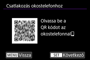 - Ha nincs telepítve a Camera Connect, olvassa be az okostelefonnal a képernyőn megjelenő QR-kódot, nyissa meg a Google Play vagy az App Store áruházat a Camera Connect letöltéséhez, majd nyomja meg a(z)