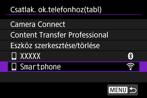 gomb megnyomása után érintse meg a Camera Connect kívánt funkcióját a(z) Wi-Fi-kapcsolat létesítéséhez, majd kezdje újra az 1. lépéstől.