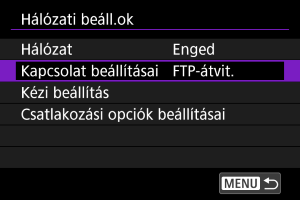 Módosíthatja vagy törölheti a fényképezőgépen mentett kommunikációs és funkcióbeállításokat, illetve új beállításokat adhat hozzá. Azokat a beállításokat is konfigurálhatja, amelyek a kapcsolat varázsló használatával nem adhatók meg, ilyen például annak beállítása, hogy mi történjen akkor, ha meglévő fájlokkal egyező nevű fájlokat küld az FTP-szerverre.