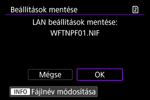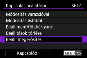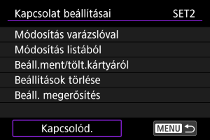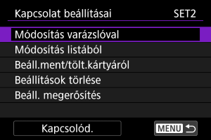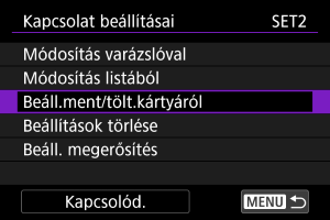 A kapcsolati beállításokat kártyára mentheti, és más fényképezőgépeken használhatja azokat. Ehhez hasonlóan a más fényképezőgépeken konfigurált kapcsolati beállítások is betölthetők a fényképezőgépre.