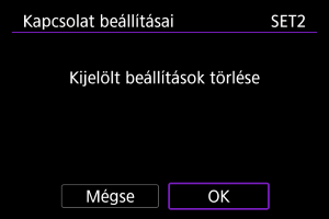- A(z) [Kijelölt törlése] lehetőség kiválasztásával törölheti a tárolt kapcsolati beállításokat tartalmazó funkcióbeállításokat. A megerősítést kérő képernyőn válassza ki a(z) [OK] lehetőséget.