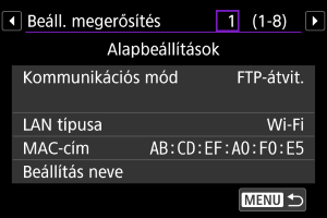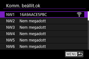 A(z) [Kiválasztás listából] lehetőség kiválasztásával megjelenítheti a fényképezőgépen mentett kommunikációs beállítások listáját. Válassza ki a használni kívánt kommunikációs beállításokat.