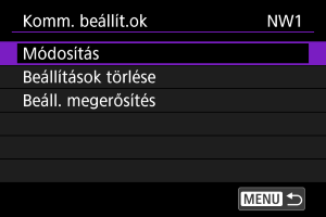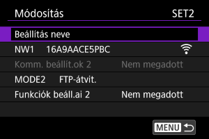 A fényképezőgépen mentett kapcsolati beállításokat a fényképezőgépen mentett kommunikációs és funkcióbeállítások használatával is módosíthatja. A beállításokhoz nevet is tárolhat a készüléken.