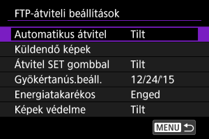 Állítsa a(z) [Enged] lehetőségre, ha azt szeretné, hogy a fényképezőgép akkor is csatlakozzon az FTP-szerverhez, ha a gyökértanúsítvány alapján nem állapítható meg, hogy a szerver megbízható-e. Ebben az esetben gondoskodjon megfelelő biztonsági óvintézkedésekről.