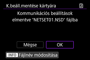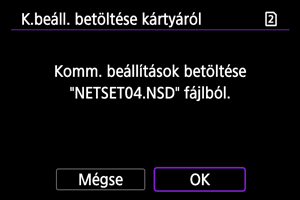 : Beáll.ment./betölt.kártyáról] opció segítségével a fényképezőgépen tárolt minden kommunikációs beállítást kártyára menthet, illetve betöltheti a más fényképezőgépekkel konfigurált és kártyára mentett összes kommunikációs beállítást.