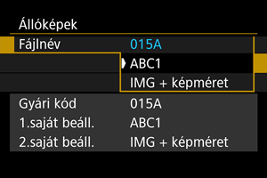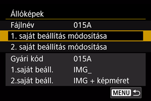 Az 1. saját beállítás használatával tetszőlegesen választhatja ki a négy karaktert. A 2. saját beállítás használatával tetszőlegesen beállíthatja az első három karaktert, amelyet a készülék a felvételkészítést követően automatikus kiegészít a képméretet jelölő negyedik karakterrel.