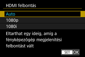 Beállíthatja azt a képfelbontást, amelyet a fényképezőgép akkor használ, ha egy HDMI-kábel segítségével TV-készülékhez vagy külső rögzítőeszközhöz csatlakoztatja azt.