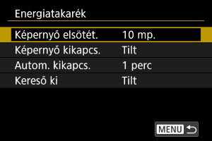Beállíthatja, hogy mikor halványuljon el és kapcsoljon ki a képernyő, mikor kapcsoljon ki a fényképezőgép, illetve mikor kapcsoljon ki a kereső, ha nem használja a fényképezőgépet (Képernyő elhalványítása, Képernyő kikapcsolása, Automatikus kikapcsolás és Kereső kikapcsolása).