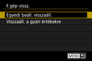 A fényképezőgép felvételkészítési funkcióival, valamint a menüfunkciókkal kapcsolatos beállítások visszaállíthatók az alapértelmezett értékekre.