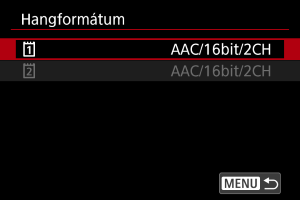 - A(z) [LPCM/24bit/4CH] lehetőség kiválasztásával négycsatornás hangfelvételt végezhet (több mikrofonnal). A(z) [AAC/16bit/2CH] érték kiválasztása két csatornára korlátozza a felvételt (egy mikrofonnal).