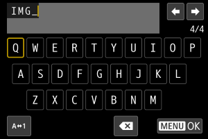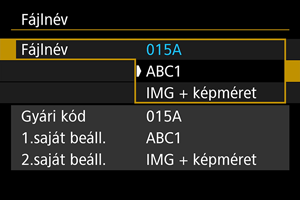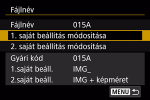 Az 1. saját beállítás használatával tetszőlegesen választhatja ki a négy karaktert. A 2. saját beállítás használatával tetszőlegesen beállíthatja az első három karaktert, amelyet a készülék a felvételkészítést követően automatikus kiegészít a képméretet jelölő negyedik karakterrel.