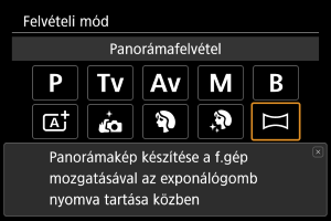 A panorámakép a fényképezőgép adott irányba történő mozgatása során készített folyamatos felvételkor rögzített felvételek kombinálásából épül fel, amelyhez az exponálógomb teljes lenyomása szükséges.