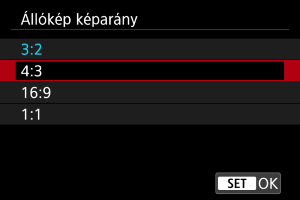 A képeket a készülék mindig [3:2] képaránnyal menti. A kiválasztott képarányadatokat a fényképezőgép csatolja a RAW-képfájlhoz, amely lehetővé teszi a Digital Photo Professional (EOS szoftver) számára, hogy a felvételkor beállított képmérettel megegyező méretarányú képet készítsen, amikor a RAW-képeket ezzel a szoftverrel dolgozza fel.