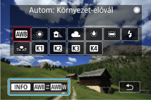 A fehéregyensúly (WB) a fehér területek fehérségének biztosítására szolgál. Az Automatikus [] (Környezet-előválasztás) vagy a(z) [