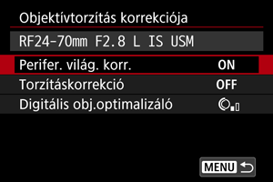 Amennyiben a képernyőn a(z) [Korrekciós adatok nem elérhetők] vagy a(z) [] ikon jelenik meg a (z) [Digitális obj.optimalizáló] mellett, az EOS Utility használatával hozzáadhatja a fényképezőgéphez az objektív korrekciós adatait. Részletekért tekintse meg az EOS Utility kezelési kézikönyvét.