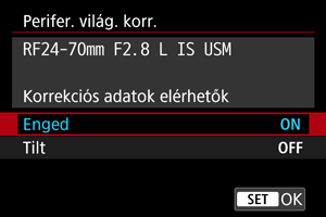 - Nem Canon gyártmányú objektív használata esetén akkor is ajánlatos a(z) [Tilt] beállítást választani, ha a kijelzőn a(z) [Korrekciós adatok elérhetők] felirat látható.