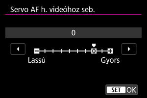 Beállíthatja a Servo AF használata videóhoz funkcióra vonatkozó AF-sebességet. A funkció akkor engedélyezett, ha a videófelvétel közbeni lassú fókuszátmenetet* támogató objektívet használ.