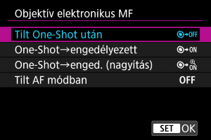Az elektronikus kézi fókusszal ellátott objektíveknél megadhatja, hogy hogyan történjen a kézi fókuszbeállítás a One-Shot AF használatával.