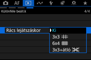 Egyképes megjelenítés esetén rács jeleníthető meg a megjelenített állóképeken a lejátszási képernyőjén. Ezzel a funkcióval kényelmesen ellenőrizheti a kép függőleges és vízszintes dőlésszögét és a kompozíciót.