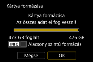 - Az alacsony szintű formázást a(z) [Mégse] lehetőség kiválasztásával bármikor megszakíthatja. A készülék még ebben az esetben is végrehajtja a normál formázást, ezért a szokásos módon használhatja a kártyát.