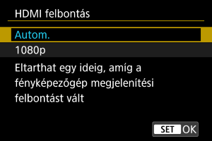 Beállíthatja azt a képfelbontást, amelyet a fényképezőgép akkor használ, ha egy HDMI-kábel segítségével TV-készülékhez vagy külső rögzítőeszközhöz csatlakoztatja azt.