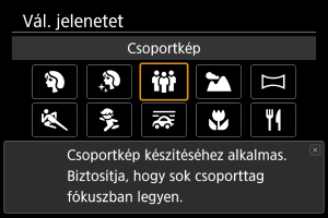 A [] (Csoportkép) funkcióval csoportokat fényképezhet. Fényképezhet úgy, hogy az elöl és hátul álló emberek egyaránt fókuszban vannak.