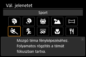 A [] (Sport) funkcióval mozgó témát, például futókat vagy mozgó járműveket fényképezhet.