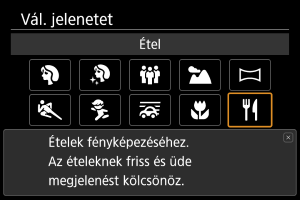 Az [] (Étel) funkció ételek fotózásához használható. A fénykép világos és étvágygerjesztő hatású lesz. Csökkenti a volfrámizzók és hasonló fényforrások vöröses árnyalatát is.
