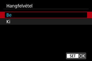 A videófelvétel közben történő hangfelvételhez válassza ki a(z) [Be] lehetőséget. A felvételhez a beépített mikrofon használható, kivéve, ha külső vagy a többfunkciós vakupapucsokhoz tervezett mikrofonokat használ.
