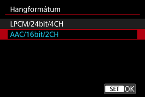 - Az [LPCM/24bit/4CH] kiválasztása esetén négycsatornás hangfelvétel készíthető. A(z) [AAC/16bit/2CH] érték kiválasztása két csatornára korlátozza a felvételt (egy mikrofonnal).