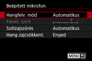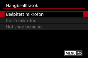 Ezek a beállítások a hangfelvételhez használt mikrofonok konfigurálására szolgálnak. Külső mikrofonok vagy többfunkciós papucshoz tervezett mikrofonok használata esetén tekintse meg a mikrofon kezelési kézikönyvét is.