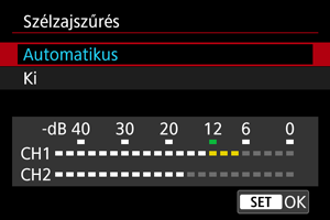 Ha [Automatikus] (vagy [Be]) értékre állítja, csökkenthető a szeles kültéri környezetben készített videóknál a hangtorzítás. A Szélzajszűrő funkció bekapcsolása esetén a készülék bizonyos mértékig a mély hangok mennyiségét is csökkenti.